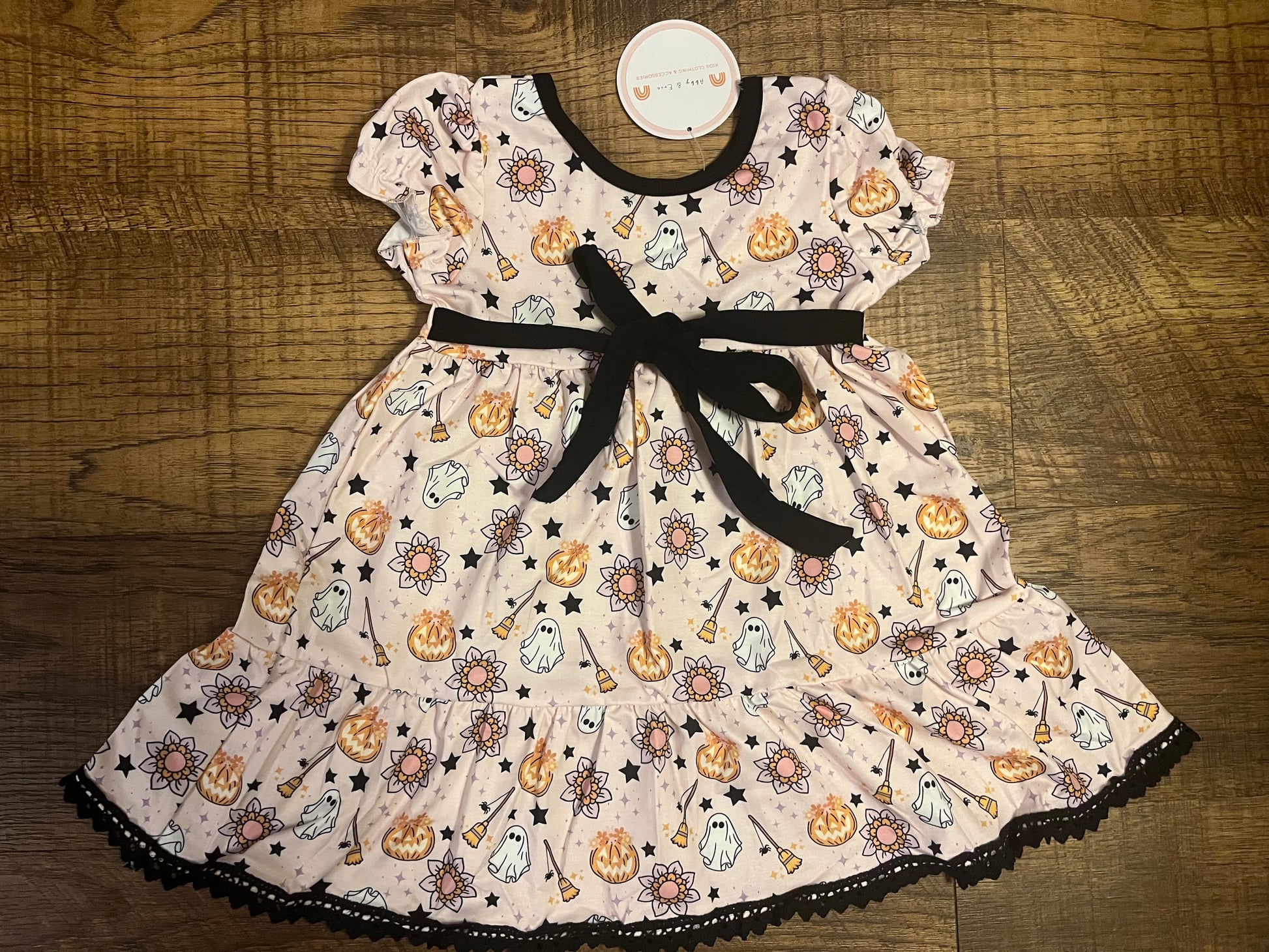 Your little one will loko adorable in this short sleeve ghost and broomstick Halloween dress in a size 2T.